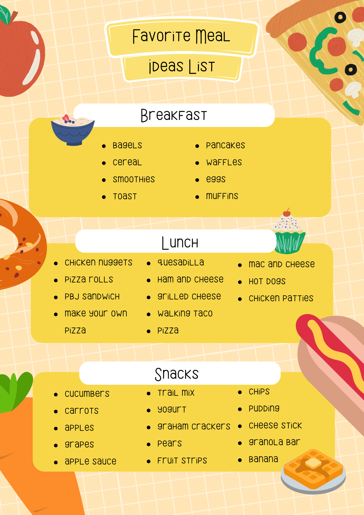 Instead of making a rigid menu, we started with a list of choices. I asked my kids to help me brainstorm their favorites for: